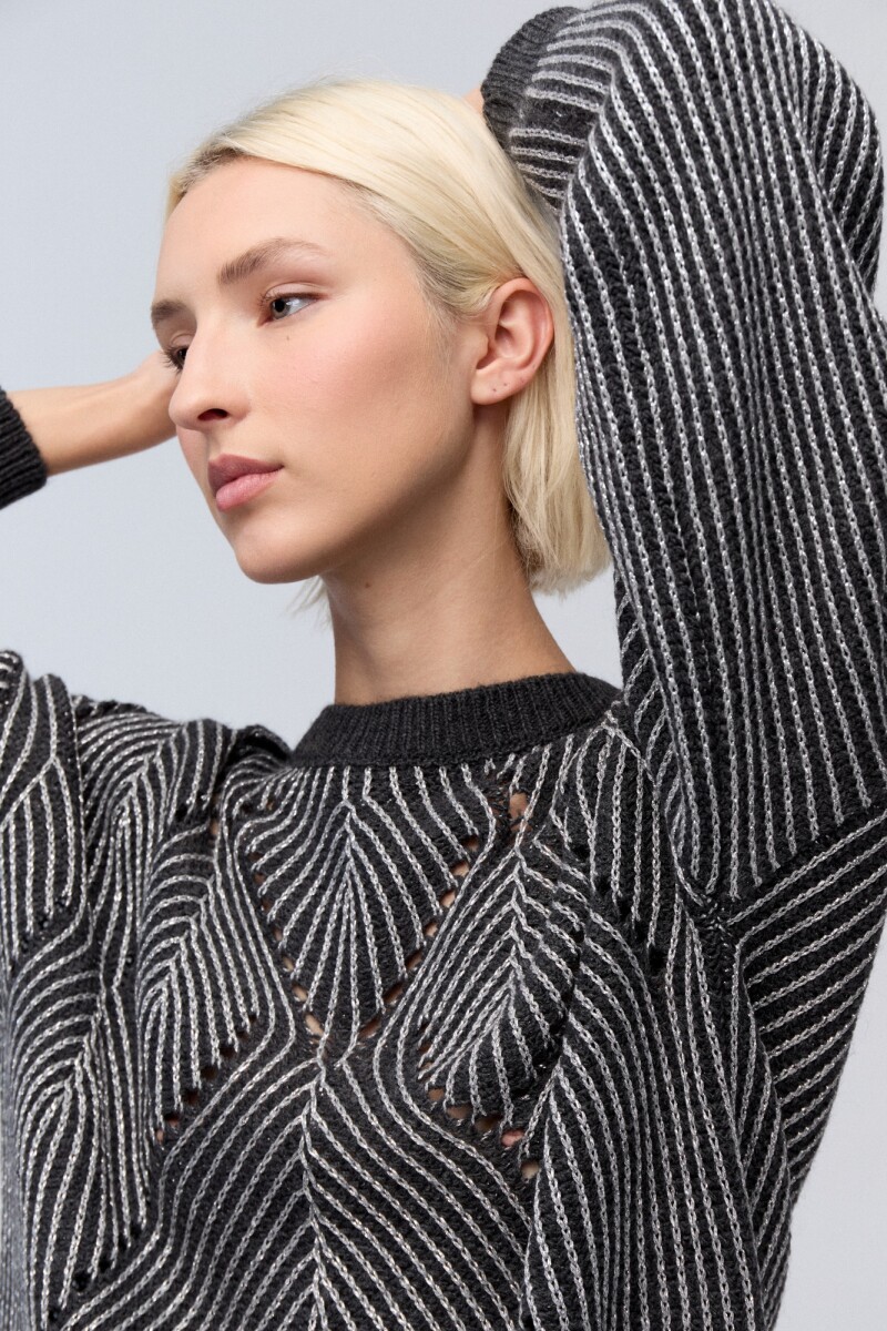 Sweater tejido con un fitting básico y toques de lurex, disponible en tres colores. Confeccionado en Italia, su textura con formas lo convierte en una prenda única y elegante.